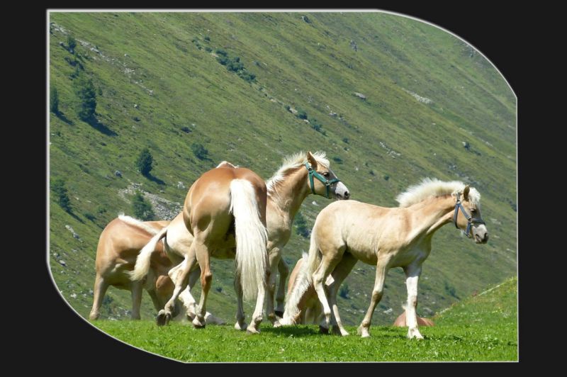 Ce bout est plus long que le premier et nous demande 1h45. Il fait bien chaud et donc vive le soda aux myrtilles... Pour la première fois, la gourde était presque vide tant il faisait soif. De très beaux chevaux aux longs poils blonds dans un champ surplombent le parking. Ce sont des haflinger et sont originaires du Tyrol.