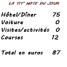 Par quoi pourrions-nous bien finir la soirée, à la télé commune il y a une sorte de débat nous intéressant peu, Internet qui était censé fonctionner est HS ??? Donc, une tisane, svp… Le jour se couche dans notre lit sous nos épaisses couvertures vers 22 heures.
