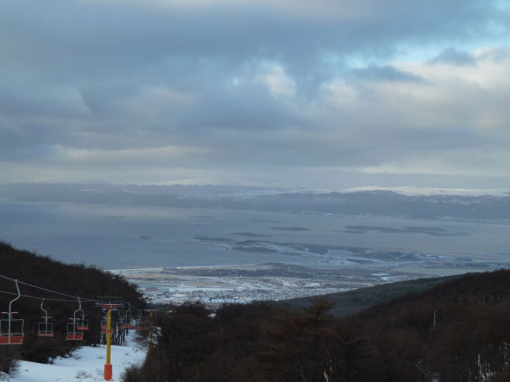 Il fait beau et nous prévoyons un programme double pour la journée: matin le glacier Martial et l'après-midi bateau... Comme c'est le premier jour, nous allons y aller à un rythme de sénateurs. Un taxi vient nous prendre à 10 heures et nous dépose, pour 20 pesos, aux pieds du télésiège. Quelques minutes d'attente au milieu des skieurs mais surtout surfeurs venus s'amuser sur la petite piste et nous voilà au départ du sentier (74 pesos pour 2). La vue est belle et on aperçoit dans le lointain le vrai bout du monde...