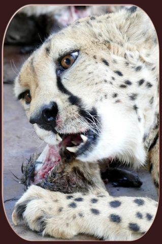 Nous repartons à 15h25 et arrivons au camp à 16 heures juste pour le nourrissage des cheetahs. Ce n’était pas prévu que nous y assistions mais comme nous sommes là, nous allons voir comment c’est organisé.