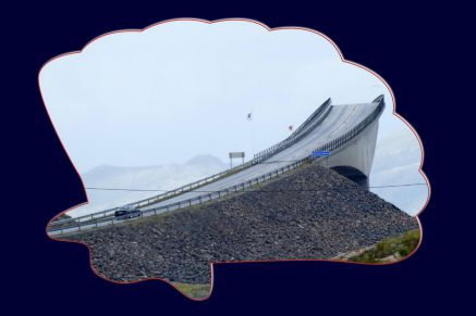 Du coup, nous repartons en bis repetita de route à ponts et marquons un long arrêt au plus fameux d’entre eux, le Storseisund. Fameux car en un point précis sa forme le fait monter vers le ciel sans voir la suite…