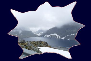 14h30, il est grand temps de reprendre la grand route jusqu’à Grotli. Un petit panneau repéré à l’allée, nous indique le chemin vers la voie touristique du jour la Gamle Strynefjellsvegen (vielle route entre Stryn et Fjell), 27 kilomètres sont nécessaires pour rejoindre Videsæter. Construite au XIXème siècle, donc avec une largeur l’interdisant aux gros véhicules, elle serpente principalement dans une vallée entourée de hautes montagnes. Frisson garantie à chaque virage et surtout quand on croise un autre véhicule. L’attention du conducteur est à son maximum. En de nombreux endroits elle est bordée de pierres pour empêcher les véhicules de plonger à l'étage du dessous. La neige est encore bien présente et donne à ce parcours un air hivernal qui lui va bien.
